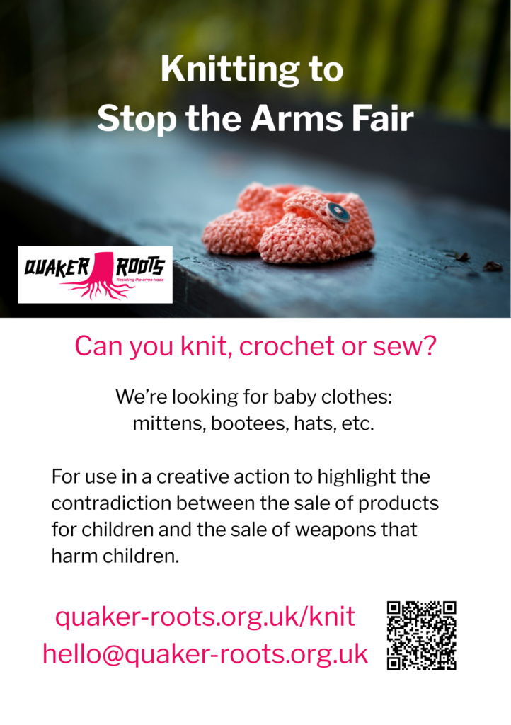 Quaker Roots are looking for baby clothes: mittens, bootees, hats, etc. For use in a creative action to highlight the contradiction between the sale of products for children and the sale of weapons that harm children.